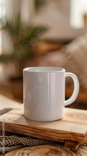 Minimalist White Mug on Wooden Surface with Cozy Background Setting