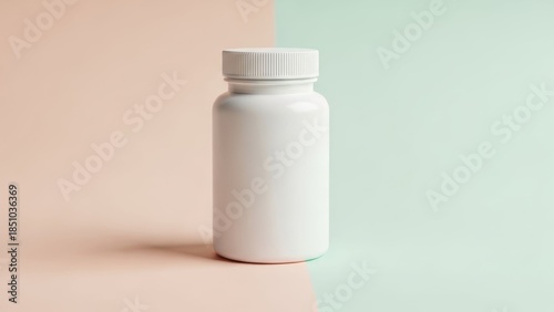 Minimalist white plastic supplement bottle with secure cap on pastel background
