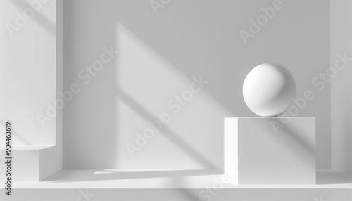 Minimalist white room with a geometric sculpture, emphasizing clean lines and soft natural light, creating a serene and modern atmosphere.