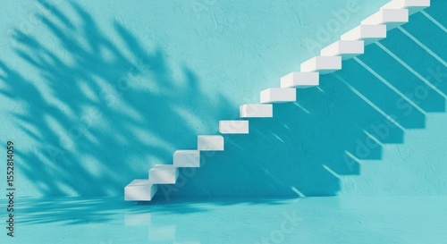 staircase, step, climbing, ascending, white, turquoise, blue, wall, textured, shadow, leaf, dappled, light, geometric, minimalist, modern, architecture, design, concept, progress, growth, success, abstract, interior, and
