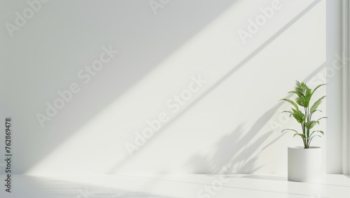 Minimalist white wall with a plant in the corner, casting soft shadows on the clean floor