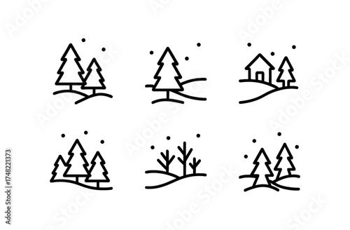 minimalist, icon, linear, winter, snow, tree, nature, outline, simple, set, landscape, pine, forest, cabin, cold, season, graphic, design, black, white, collection, holiday, tranquil, serene, peaceful, environment, snowfall, art, december, jan, february, seasonal, illustration