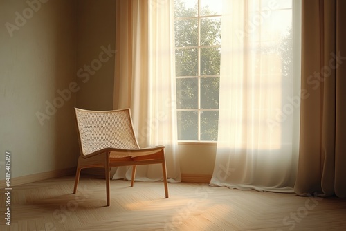 Minimalist wooden chair with woven backrest illuminated by warm natural light through large window with sheer curtains in empty room
