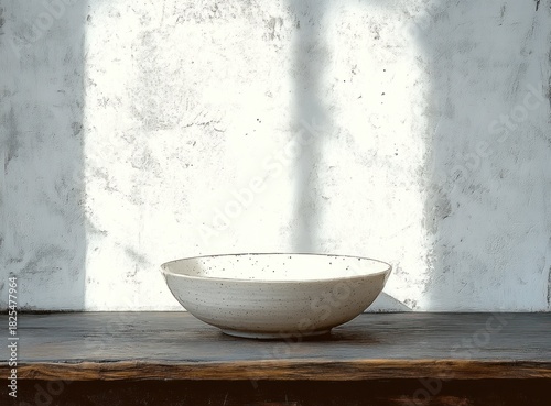 Minimalistic ceramic bowl on rustic wooden table with textured white wall and soft sunlight creating a peaceful simple scene
