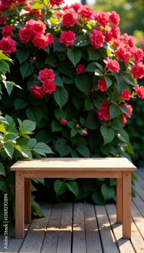 Minimalistic wooden outdoor table against vibrant floral backdrop, floral, outdoor