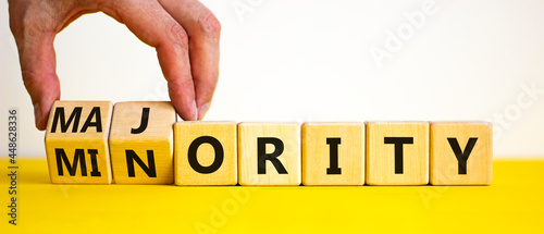 Minority or majority symbol. Businessman turns wooden cubes and changes the word 'minority' to 'majority'. Beautiful white background. Minority or majority and business concept. Copy space.
