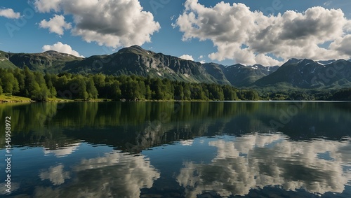 Mirror-Like Lake Reflecting Majestic Mountains and Clouds