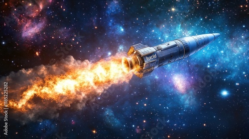rocket, space, launch, cosmos, star, galaxy, nebula, fire, flight, exploration, adventure, technology, science, future, innovation, progress, astronomy, propulsion, speed, power, energy, journey, mission, universe, celestial, night, dark, bright, high-coloured, dramatic, intense, awe, wonder, mystery, enigma, limitless, lucid, missile