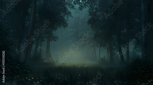 Mist envelops a tranquil forest clearing during the early morning hours creating an ethereal atmosphere