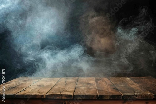 Misty Atmosphere - Fog and Haze Over Wooden Surface - Abstract Halloween Background. Beautiful simple AI generated image in 4K, unique.