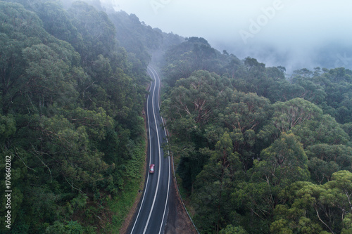 aerial, highway, road, forest, australia, cloud, green, infused, tree, curved, mountain, route, wet