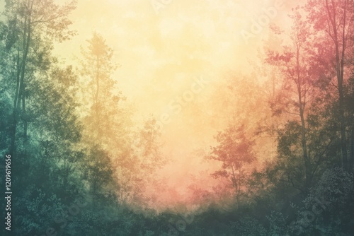 tree, forest, misty, sunrise, nature, timberland, morning, fog, sun, light, sky, branch, leaf, wood, landscape, scenery, aethereal, mystical, magical, dreamy, peaceful, serene, tranquil, calm, quiet, soft, gentle, subtile, colours, pastel, yellow, orange, pink, green, teal, blue, hue, shade, tone, texture, atmosphere, ambience