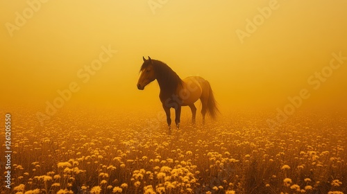 horse, horse farm, mist, field, gold, flower, animal, nature, fog, wildlife, meadow, sunset, golden hour, dust, landscape, rural, outdoors, beauty, calm, peaceful, solitary, alone, freedom, adventure, wild, scenic, travel, photo, dreamy, visionary, fantasy, golden light, misty, grass, wildflower, blooming, rustic, exterior, flora, fauna, foggy, rural scene, floral