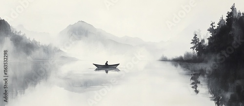 landscape, nature, serene, misty, fog, lake, mountain, tree, boat, calmness, peaceful, calm, quiet, monochrome, ink, painting, watercolor, zen, minimalist, art, tranquil, artistic, still, serenity, tranquil scene, scenic