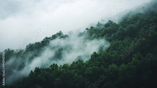 Misty mountain forest landscape green trees nature scenery fog sky view calm dark deep lush wild