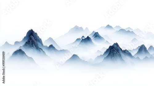 Misty Mountain Peaks in Chinese Ink Brush Style, elegant and serene landscape featuring soft, flowing lines and subtle gradients, evoking tranquility and the beauty of nature.