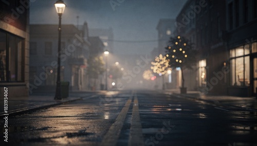 street, night, rain, wet, reflections, light, urban, city, town, atmospheric, empty, road, pavement, building, street light, fog, mist, quiet, dark, glow, illuminated, deserted, solitude, mysterious, downtown, perspective, depth, bokeh, asphalt, weather, cold, winter, evening, mood, serene, calm, dim, glare, sparkle, shimmer, drizzle, thoroughfare, paseo, architecture, window, tree, decoration, festive