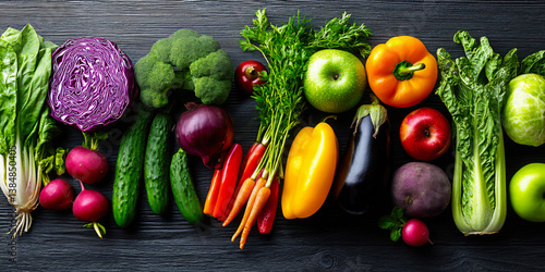 Mixed fruits and vegetables arranged beautifully on a dark wooden surface in a colorful display