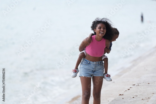 Mixed race African and Asian mother and boy is playing at the outdoor area. smiling happy family have fun running on the beach. portrait of mom and kid lifestyle with a unique hairstyle.