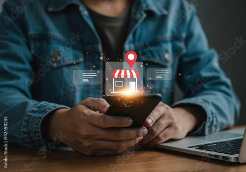 smartphone, mobile, business, location, online, shop, app, digital, marketing, entrepreneurship, e-business, hand, user, technology, commerce, design, icon, overlay, virtual, modern, convenient, strategy, productivity, sharpened, work, office, home office, laptop, wooden table, casual attire, entrepreneur, retail, map, pin, review, customer service, platform, growth