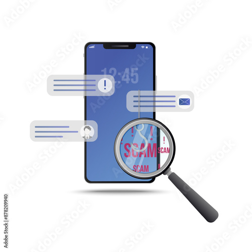 Mobile Fraud Alert, Phone scam, Online Warning notification, Device antivirus protection. Suspicious software or Malware Spreading Virus. Vector illustration isolated on white background.