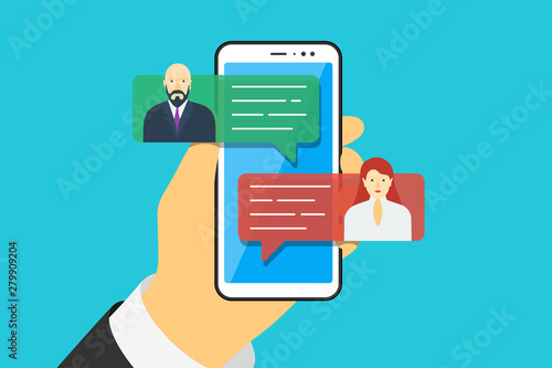 Mobile phone chat message notifications vector illustration on blue background. Hand holding smartphone and chatting bubble speeches. Online talking speak conversation dialog concept