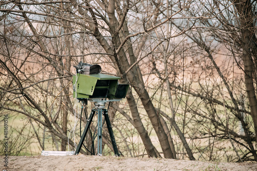 Mobile Road Police Radar On Tripod For Traffic Speed Control. Speed Camera On Highway. Mobile Police Radar On Tripod For Traffic Speed. Control Speed Limit Camera On Highway Road.