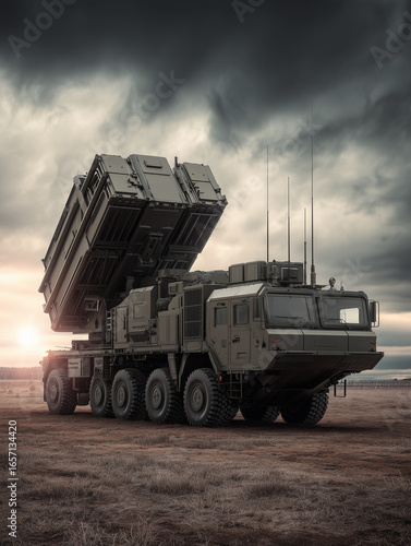 Mobile rocket launcher deploying missiles at sunset under dramatic sky