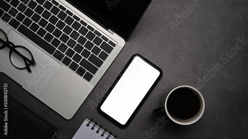 Mock up smart phone with blank screen, laptop computer, notebook and coffee cup on dark stone background. Flat lay.