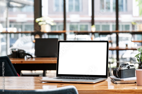 Mockup blank white screen laptop computer on wooden table in co-workspace.