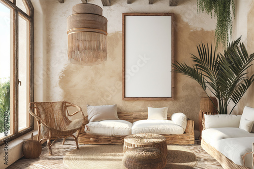 Mockup frame in a boho nomadic interior background with rural decorations