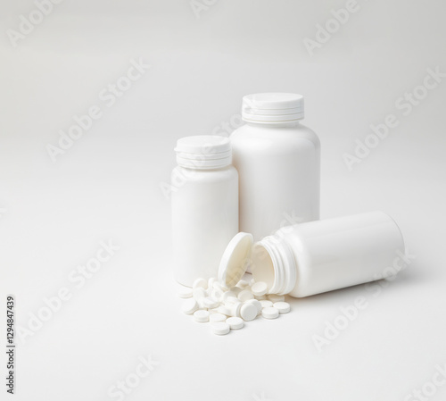 Mockup of a aspirin bottles, different sizes, one lying down open, on white background with copyspace