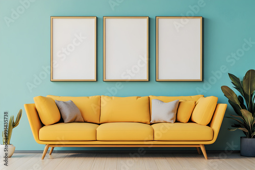 Mockup of Three Empty White Wall Art A4 Posters on Teal Wall Above Yellow Sofa in Minimalist Interior Design
