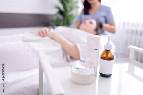Mock-ups of beauty cosmetology products on table in cosmetologist office in spa salon or clinic. Dermatologist and her client in background are blurred.