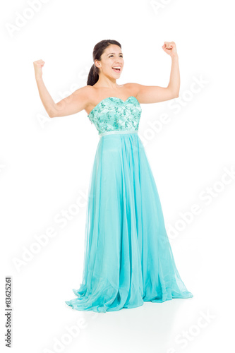 cheerful, excitement, freedom, idea, nightlife, adult, arm, beautiful, cheering, copy space, cut-out, cute, dress, evening gown, female, free, full-length, fun, girl, happy, isolated, isolated on white, long hair, mexican, model, motivation, one person, people, person, pride, raised, raising, relaxation, smiling, standing, studio shot, success, successful, up, victory, well-dressed, white background, winner, winning, woman, young adult