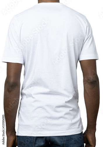 Modello di colore che indossa t-shirt bianca visto da dietro
