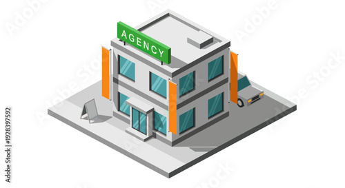 Modern Agency Building with Signage and Isometric View.