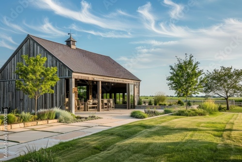 exterior, modern, architecture, building, landscape, grass, green, nature, outdoors, sky, summer, estate, farmland, front, horizon, luxury, outside, property, residential, barn, foreground, holland, dutch, home, new, rural, blue, country, design, field, house, metal, wall, agriculture, background, countryside, environment, farm, garden, contemporary, custom, driveway, expensive, farming, window, rustic