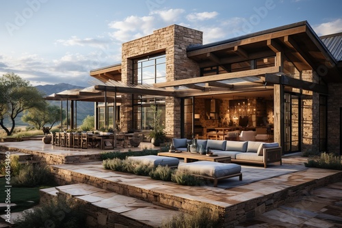 modern American ranch-style home, emphasizing single-story living, an open layout, and large windows that seamlessly connect the indoors with outdoor spaces.Generated with AI