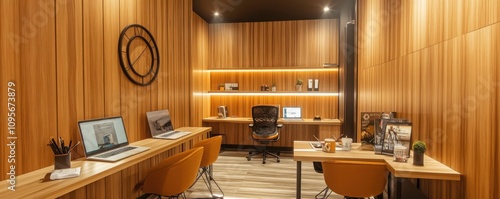 Modern and Inviting Home Office with Wooden Accent Walls, Stylish Furniture, and Well-Organized Workspace for Productivity and Creativity