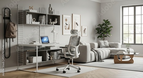 desk, furniture, chair, shelf, living room, home, decoration, interior design, workstation, workspace, decor, work, study, computer, laptop, book, art, plant, sofa, couch, design, lifestyle, architecture, comfortable, cosy, elegant, clean, modern, professional, organised, productive, creative, space, environment, light, window, accessory, functional, stylish