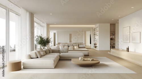 Modern and minimalist interior design featuring a spacious living room with neutral tones photo