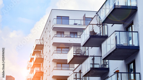 Modern and new apartment building. Multistoried modern, new and stylish living block of flats.