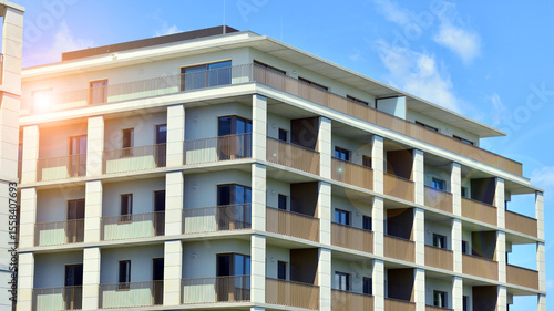 Modern apartment buildings on a sunny day with a blue sky. Facade of a modern apartment building. Modern residential apartment building complex condo.