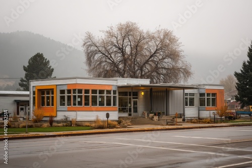 Modern Architecture on Foggy Day showcasing Metal Siding and Orange Window Frames with Bare Tree looming over Building
