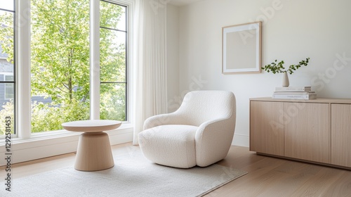 Modern armchair in bright living room, near window, leafy trees outside. Home interior design
