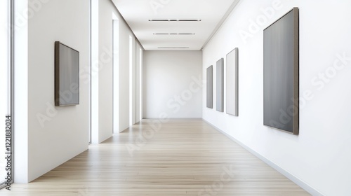 Modern Art Gallery Interior: Serene Minimalist White Hallway with Paintings