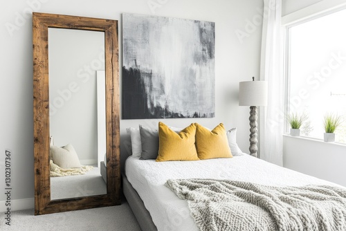 bedchamber, modern, mirror, full-length, grey, bedding, pillow, yellow, minimalist, interior, design, home, decor, style, contemporary, furniture, room, house, apartment, wall, art, canvas, lamp, window, light, cosy, comfortable, serene, peaceful, calm, relaxing, simple, elegant, clean, bright, roomy, white, grey, neutral, texture, soft, fluffy, blanket, throw, plant
