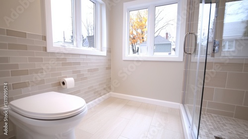 bathroom, interior, design, modern, beige, tile, privies, shower, glasses, window, light, neutral, contemporary, home, renovation, remodel, clean, bright, minimalist, elegant, luxury, serene, calm, spa, relaxation, wall, floor, flooring, white, grey, decor, architecture, real estate, property, house, apartment, style, room, space, residential, tranquil, peaceful