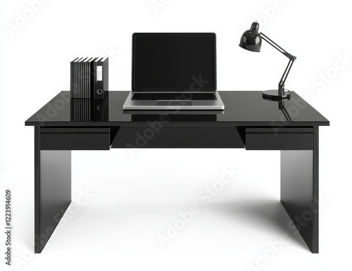 desk, laptop, computer, lamp, office, black, modern, table, file, folder, work, study, home, workspace, technology, equipment, furniture, design, clean, simple, elegant, professional, style, room, interior, workplace, contemporary, minimal, sleek, glasses, shiny, surface, drawer, storage, light, illumination, screen, keyboard, mouse, document, paperwork, productivity, efficiency, organisation, arrangement, setting, background